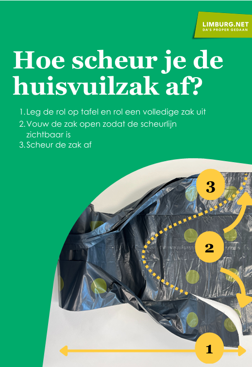De nieuwste lading huisvuilzakken heeft (tijdelijk) een andere vouwwijze en dus een iets andere manier van afscheuren. In principe geen probleem, maar misschien minder vanzelfsprekend als je het anders gewoon bent.