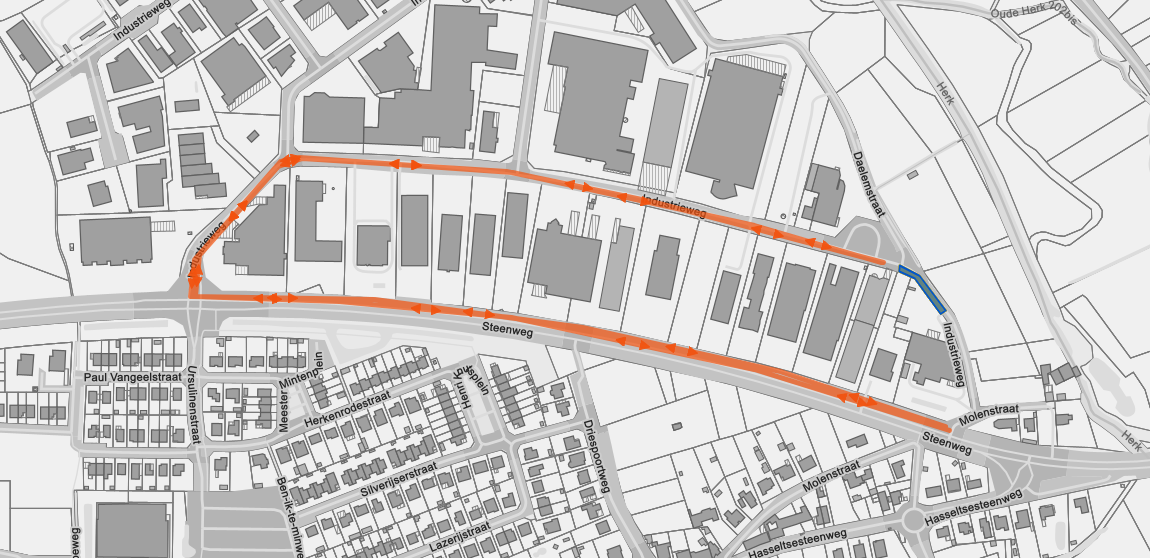 De werkzaamheden concentreren zich op het blauwe gedeelte van de Industrieweg, zoals weergegeven op de kaart hieronder. Het oranje gedeelte op de kaart geeft de omleiding aan die gevolgd kan worden.